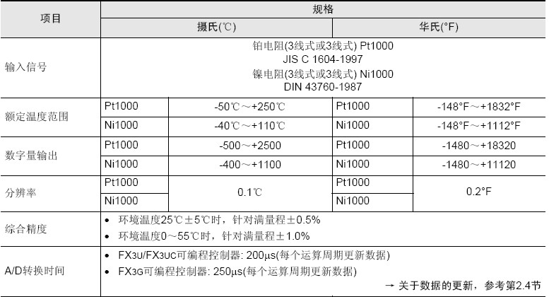 3) 测定的温度被自动写入FX3U、FX3UC、FX3G可编程控制器的特殊数据寄存器中。