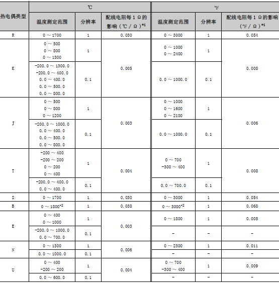 [可使用的温度传感器的类型、温度测定范围、分辨率及配线电阻每1Ω的影响]