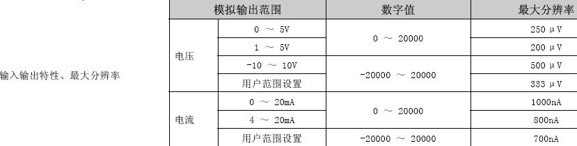模拟输出:电压:DC -10~l0V(外部负载电阻值lk欧~1M欧);电流:DC 0~20mA(外部负载电阻值0欧~600欧)